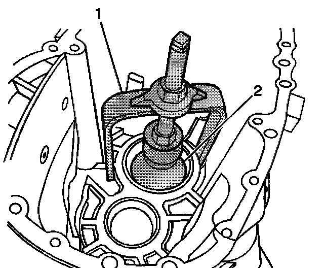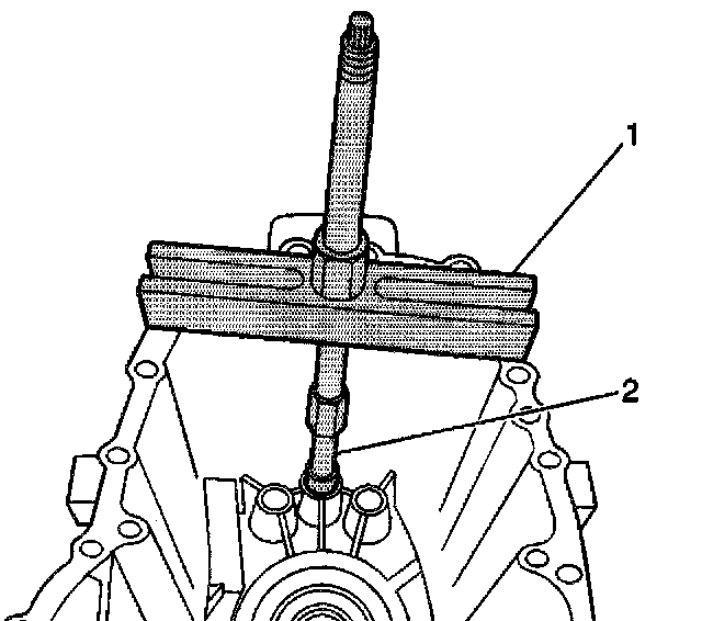 5.1. With the J 44736 (1) attached to the J 44733 (2) hit down on the forcing screw to bend the input gear oil deflector. This is to allow the J 44733 (2) to fit under the bearing race.