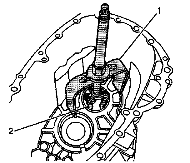 5. Remove the main shaft front bearing race using the J 44736 (1) and the J 44733 (2).