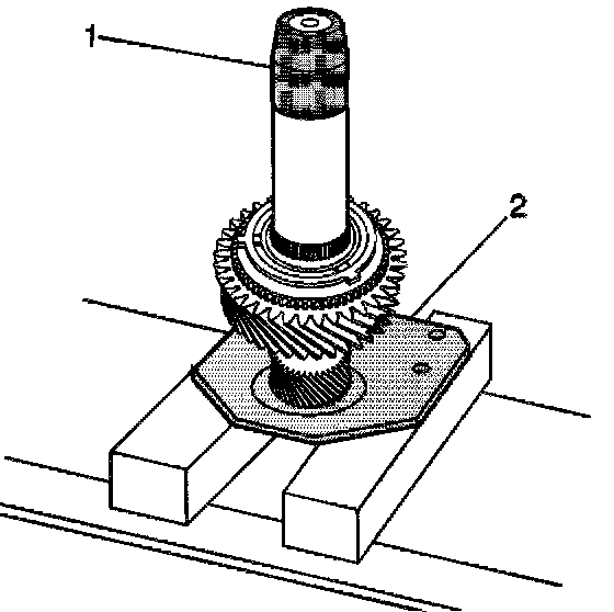 13. Position the J 44725 (2) on a hydraulic press. The J 44725 will be used to assemble the mainshaft while in a hydraulic press.