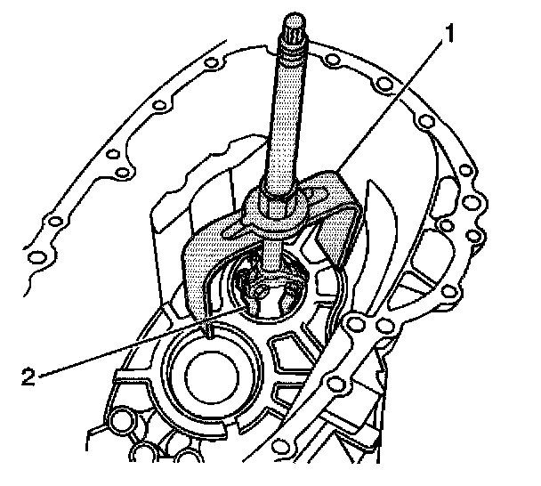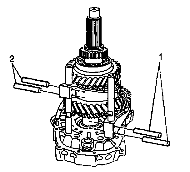 58. Remove the main shaft front bearing race using the J 44736 (1) and the J 44733 (2).