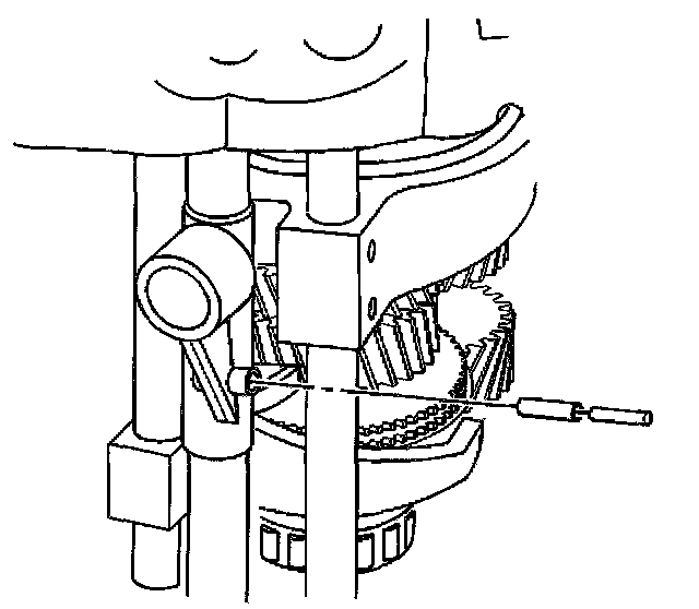 ^ Lower the gear assembly slowly in order to align the intermediate case dowel pins with the front case.