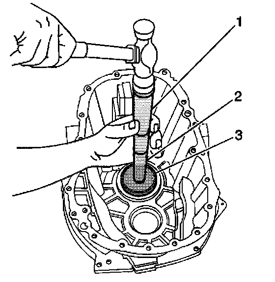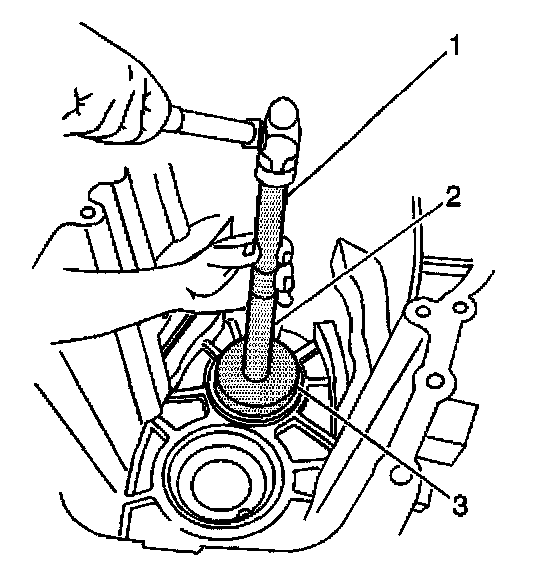 66. Install the main shaft front bearing race using the J 8092 (1), J 21465-13 (2) and the J 44746 (3).