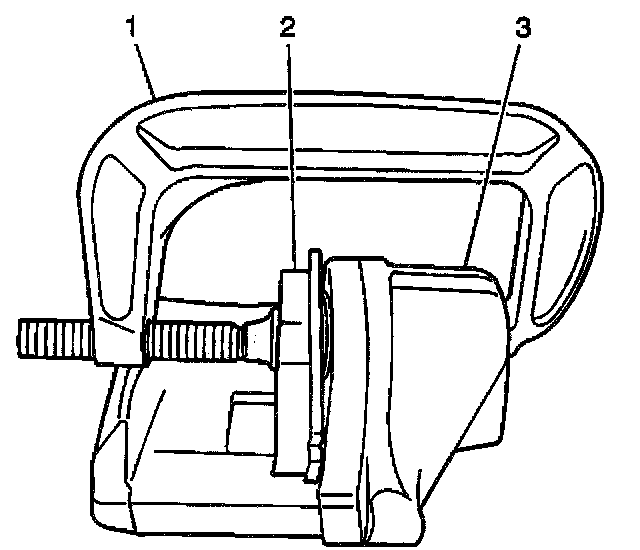 ^ For single piston caliper applications, insert a discarded inner brake pad (2) or block of wood in front of the piston. Using a large C-clamp (1) installed over the body of the caliper (3) and against the brake pad or block of wood, slowly bottom the piston in the bore.