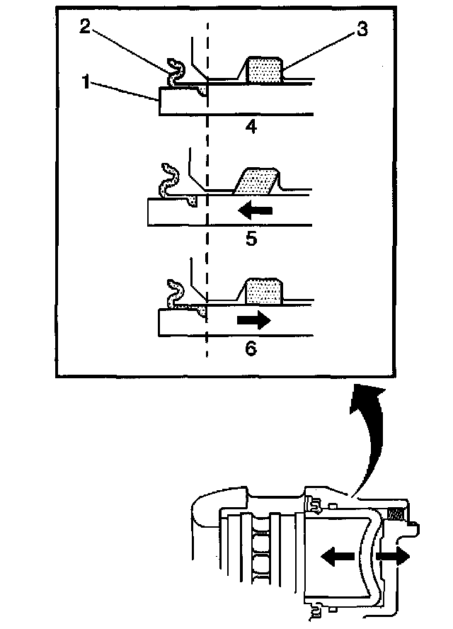 3. While the brake system is at rest (4), observe the position of the caliper piston (1) in relation to the caliper housing.