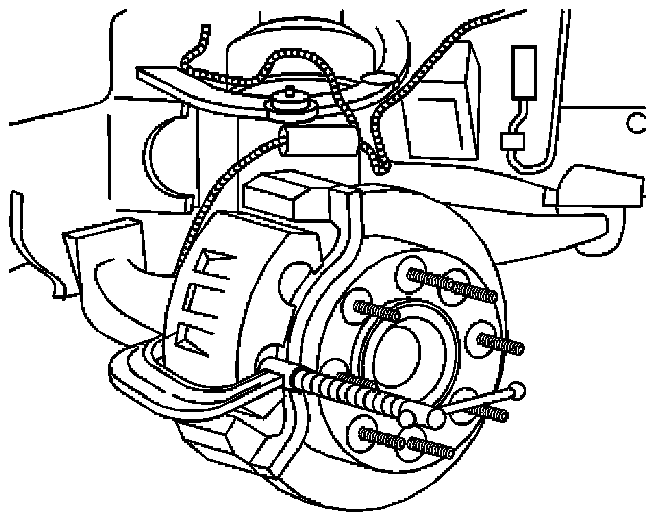 Support the brake caliper with heavy mechanic's wire, or equivalent, whenever it is separated from its mount and the hydraulic flexible brake hose is still connected. Failure to support the caliper in this manner will cause the flexible brake hose to bear the weight of the caliper, which may cause damage to the brake hose and in turn may cause a brake fluid leak.