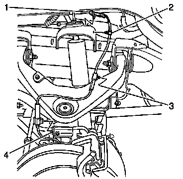 12. Remove the wheel speed harness mounting clips from the knuckle (4) upper control arm (3) and frame (2).