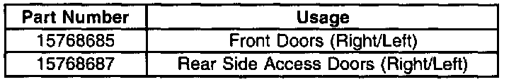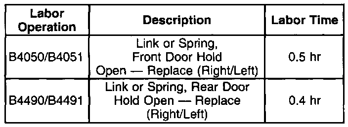 Replace the door check link on affected vehicles. Use the part numbers listed below. Refer to the Doors sub-section in the appropriate Service Manual for the Door Check Link Replacement procedure.