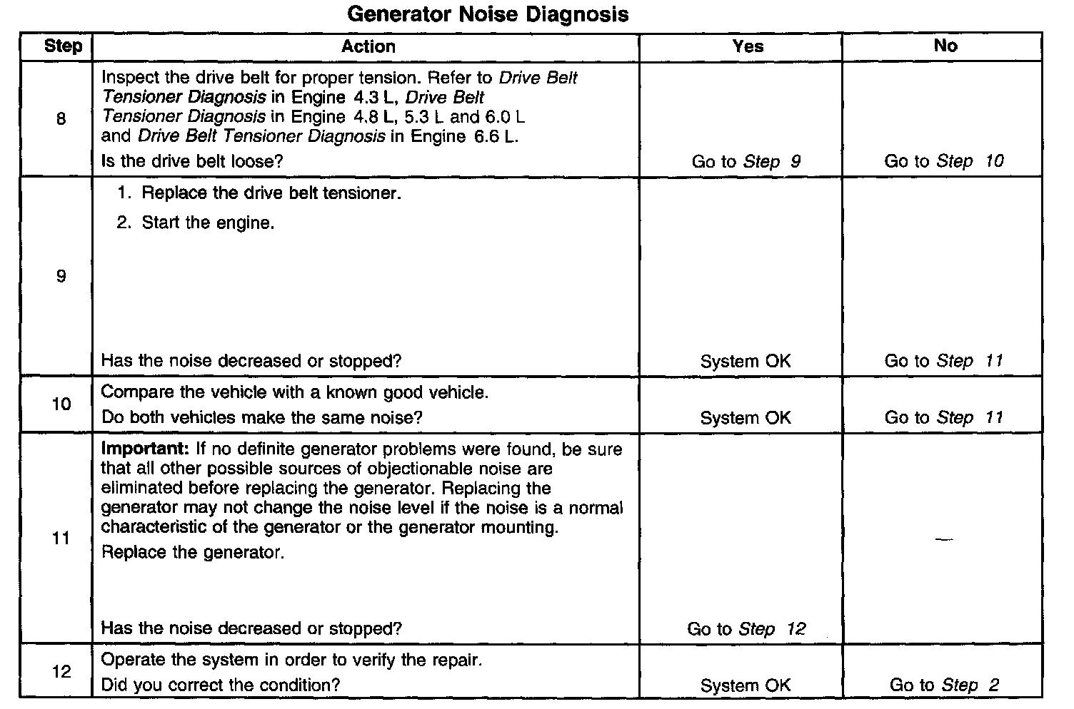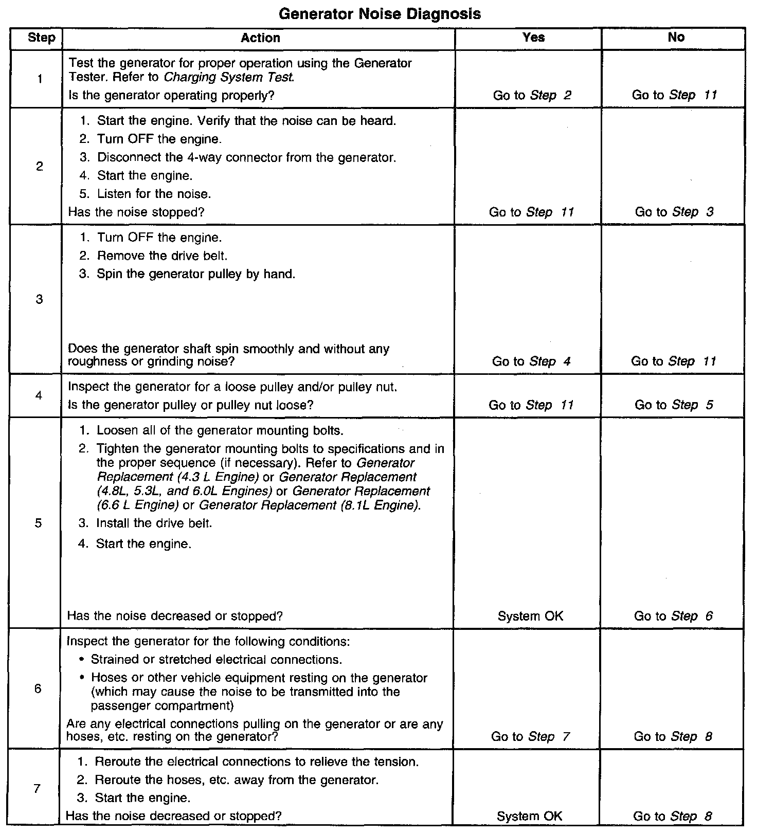 DIAGNOSTIC AIDSNoise from a generator may be due to electrical or mechanical noise. Electrical noise (magnetic whine) usually varies with the electrical load placed on the generator and is a normal operating characteristic of all generators. When diagnosing a noisy generator, it is important to remember that loose or misaligned components around the generator may transmit the noise into the passenger compartment and that replacing the generator may not solve the problem.