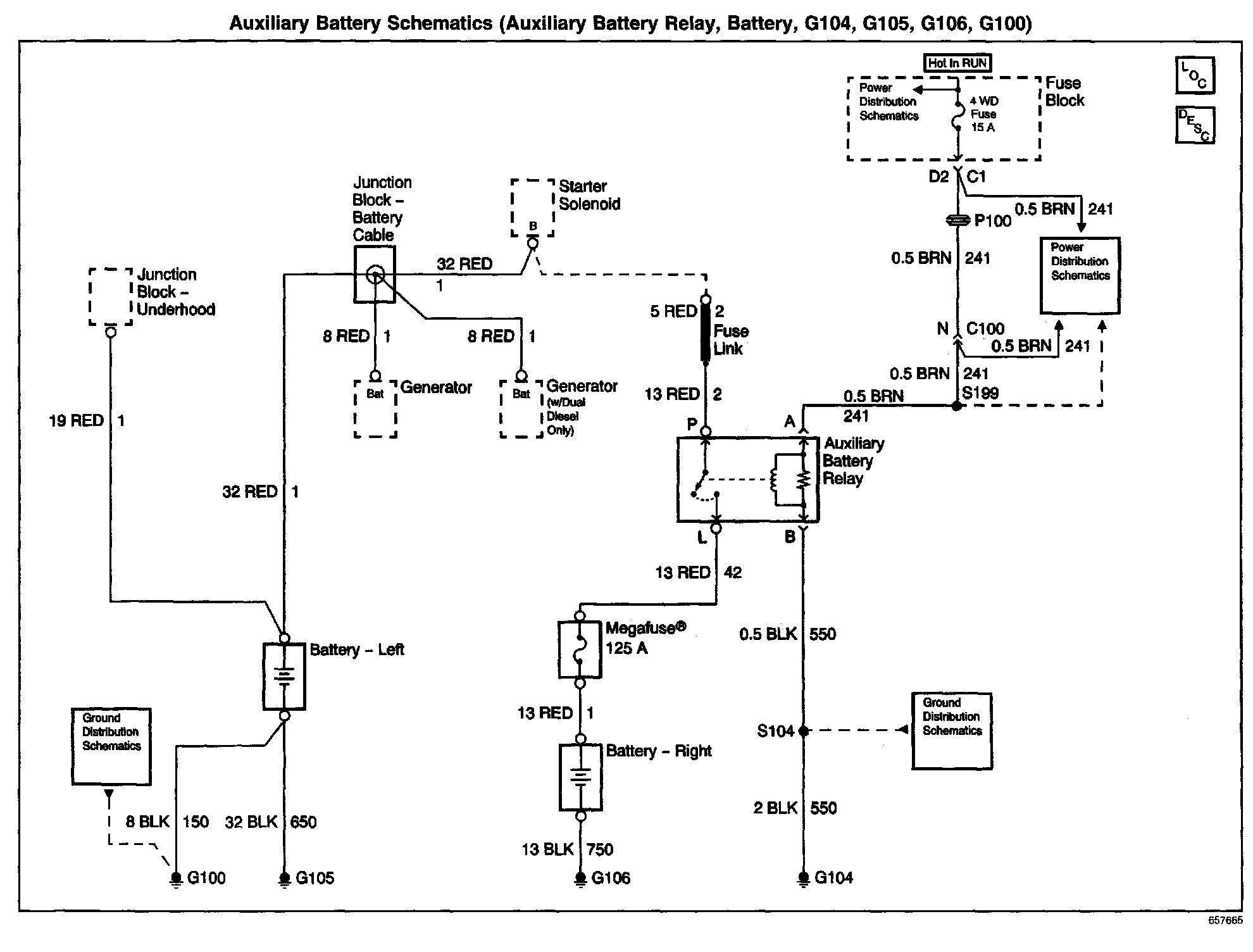 Auxiliary Battery Schematics: Auxiliary Battery Relay, Battery, G104, G105, G106, G100: