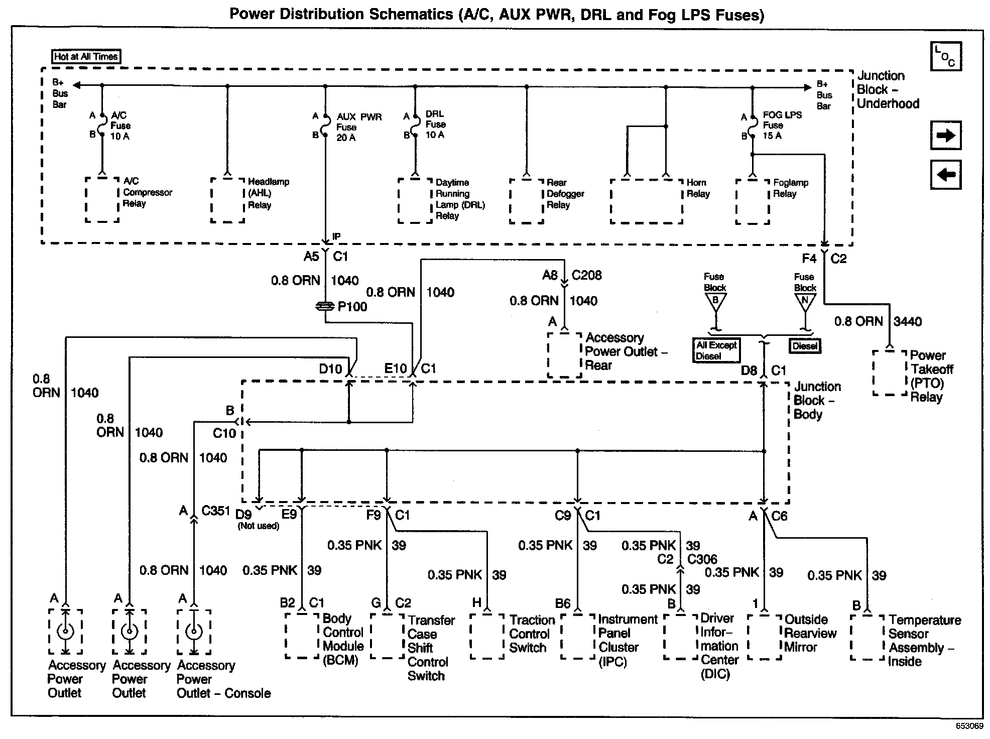 Power Distribution Schematics: A/C, AUX PWR, DRL And Fog LPS Fuses: