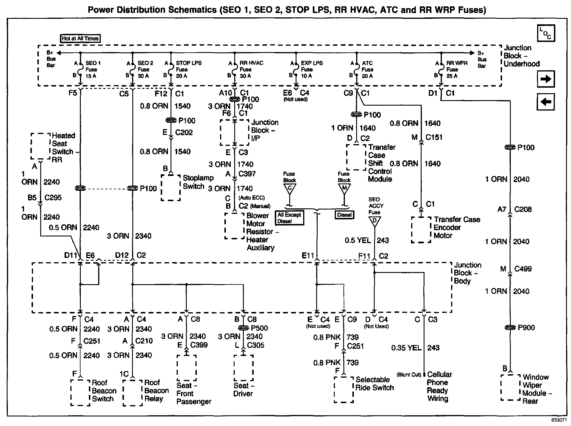 Power Distribution Schematics: SEO 1, SEO 2, STOP LPS, RR HVAC, ATC and RR WRP Fuses: