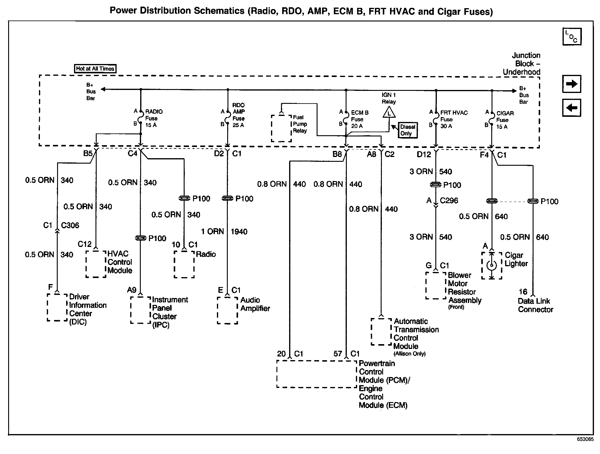 Power Distribution Schematics: Radio RDO, AMP, ECM B, FRT HVAC And Cigar Fuses: