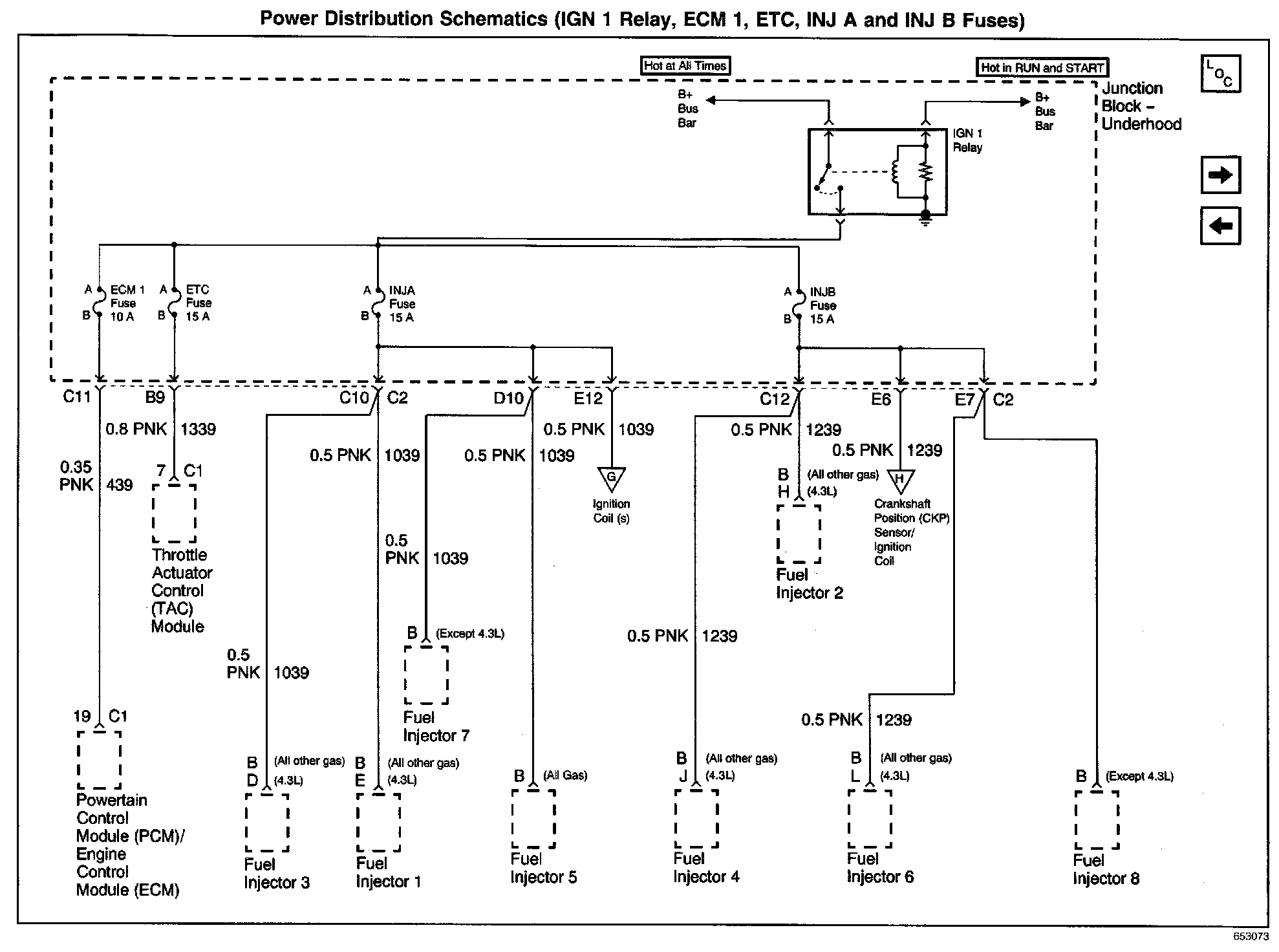 Power Distribution Schematics: IGN 1 Relay, ECM 1, ETC, INJ A And INJ B Fuses:
