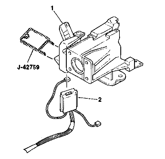 7. Insert J 42759 into the electronic lock module (1) and slide the ignition and key alarm switch assembly (2) out.