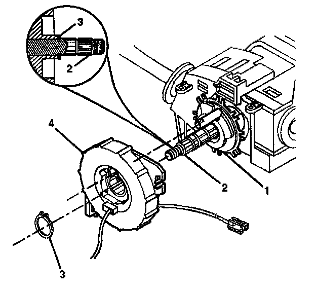 6. Slide the new inflatable restraint steering wheel module coil (4) onto the steering shaft assembly (2). Firmly seat the snap ring (3) into the groove on the steering shaft assembly (2).