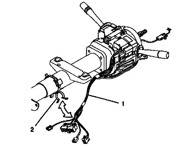 10. Attach the wire harness assembly (1) to the steering column wire harness strap (2).