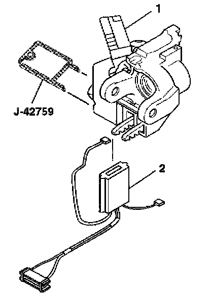 3. Insert J 42759 into the electronic lock module assembly (1) and slide the ignition and key alarm switch assembly (2) in.