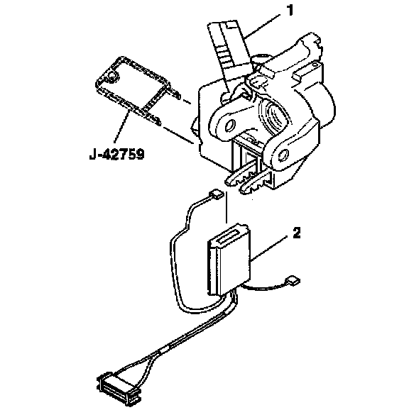6. Insert J 42759 into the electronic lock module assembly (1) and slide the ignition and key alarm switch assembly (2) out.