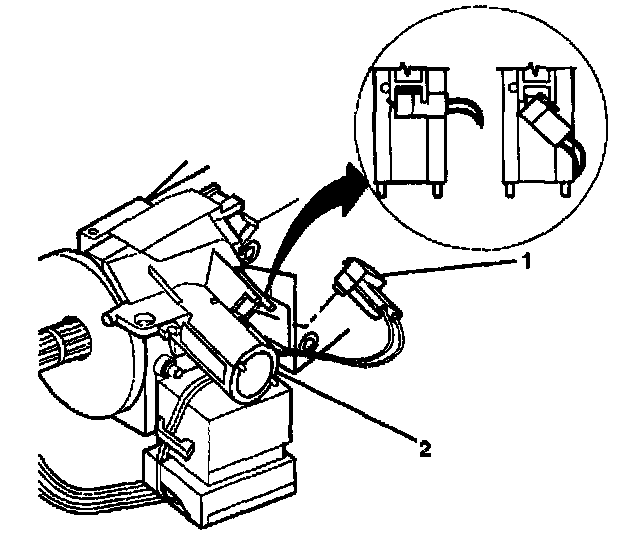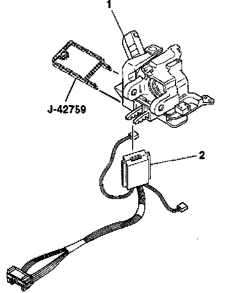 7. Insert J 42759 into the electronic lock module assembly (1) and slide the ignition and key alarm switch assembly (2) out.
