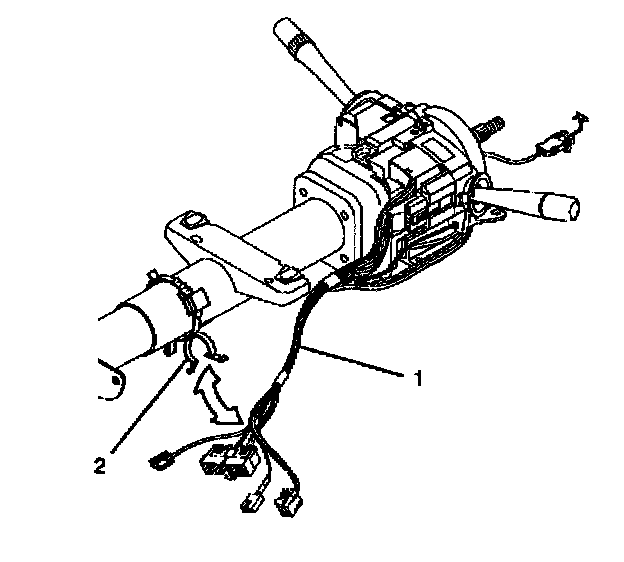 2. Remove the wire harness strap (2) from the steering column and the wire harness assembly (1).