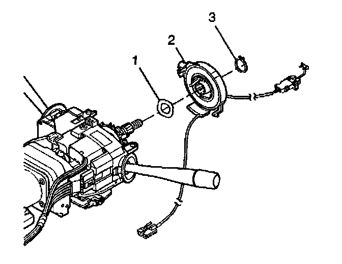 5. Remove the inflatable restraint steering wheel module coil (2) from the steering column shaft assembly.