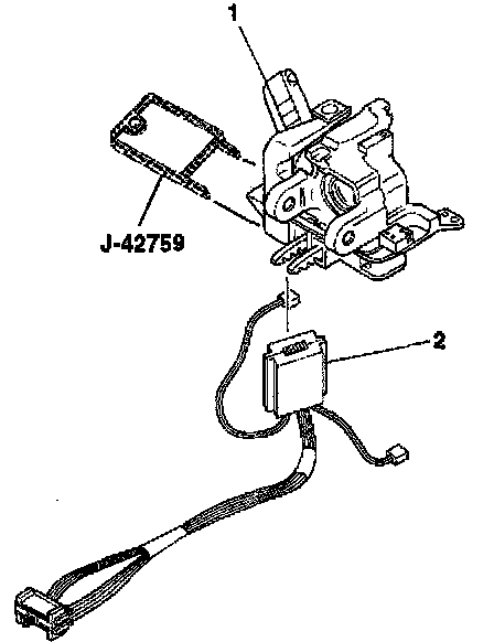 7. Insert J 42759 into the electronic lock module assembly (1) and slide the ignition and key alarm switch assembly (2) in.