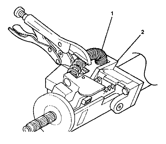 4. Install the tilt spring (1) onto the steering column support assembly (2) and onto the steering column tilt head assembly by using the following procedure: