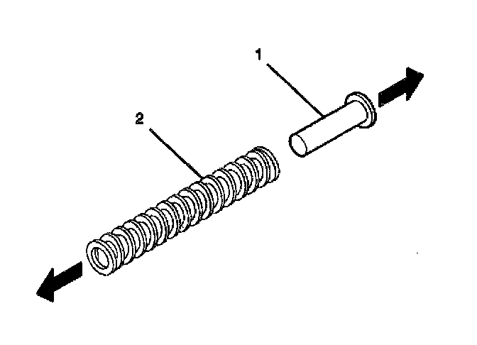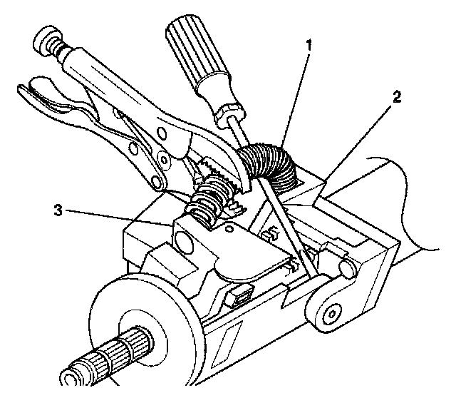 4. Remove 1 end of the tilt spring (1) from the steering column support assembly (2) and the other end from the steering column tilt head assembly (3) by using the following procedure: