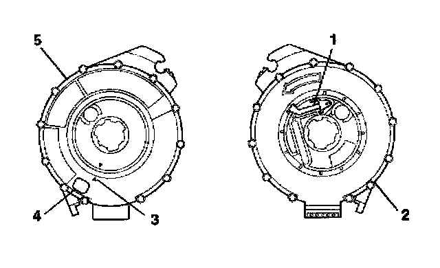 2. If the front (5) of the inflatable restraint steering wheel module coil has a centering window (4), and on the back side (2) a spring service lock (1), perform the following steps: