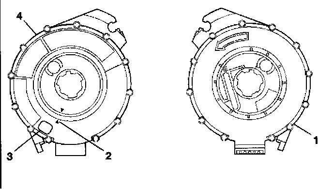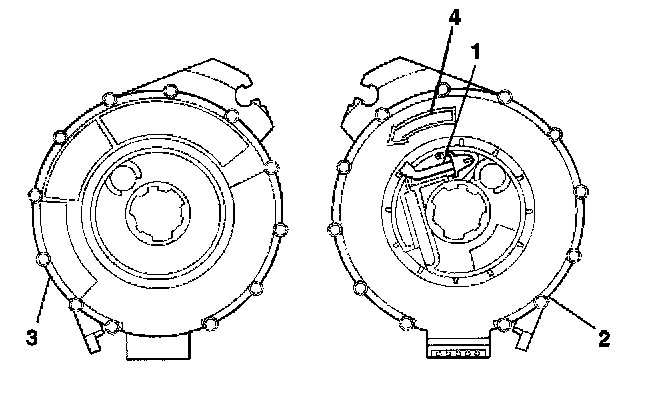 3. If the front (4) of the inflatable restraint steering wheel module coil has a centering window (3) and no spring service lock on the back side (1), perform the following steps: