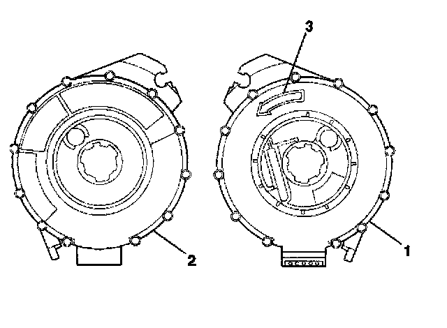 4. If no centering window is present on the front side (3) of the inflatable restraint steering wheel module coil, but a spring service lock (1) is on the back side (2), perform the following steps:
