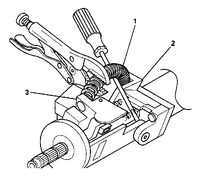 3.2. Secure the tilt spring with locking pliers and continue prying until the tilt spring disengages from the post of the steering column support assembly (3).