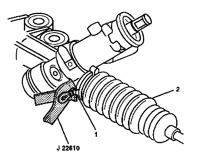 6. Install the boot clamp (1) on the rack and pinion boot (2) with J 22610.