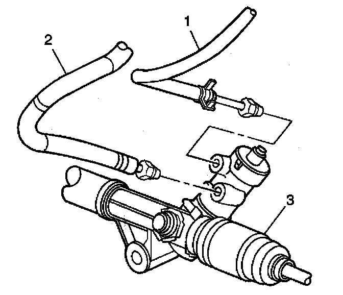8. Remove the power steering low pressure line (1) from the rack and pinion assembly (3).