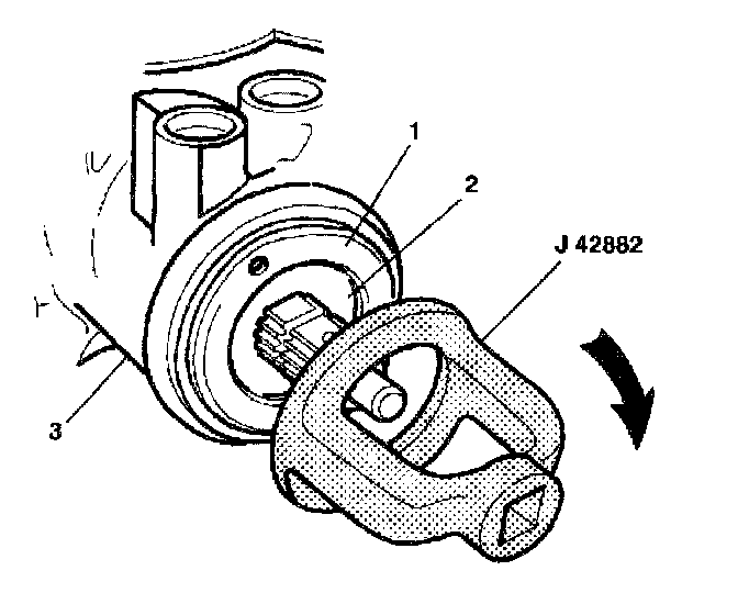 3. Turn the adjuster nut assembly (1) clockwise using J 42882 until the adjuster nut assembly (1) and the thrust support assembly (2) are firmly bottomed in the steering gear housing (3).
