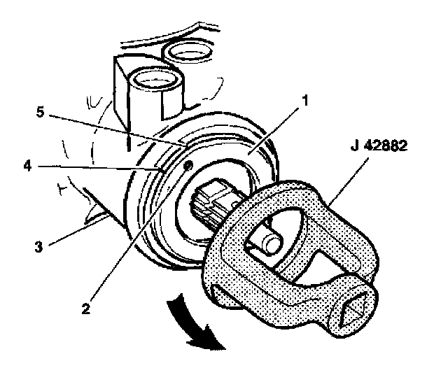 7. Using J 42882 and a torque wrench, turn the adjuster nut assembly (1) counterclockwise 15-25° to align the hole (2) in the adjuster nut assembly (1) with the second mark (4) on the steering gear housing (3).