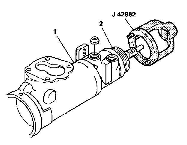 4. Connect the adjuster nut assembly (2) to the steering gear housing (1) using J 42882.