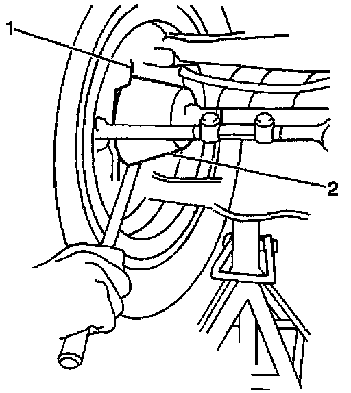 8. Pry between the lower control arm and the outer bearing race (1) while reading the dial indicator. This shows vertical looseness in the ball joints. The lower ball joint is not preloaded and may show some looseness.