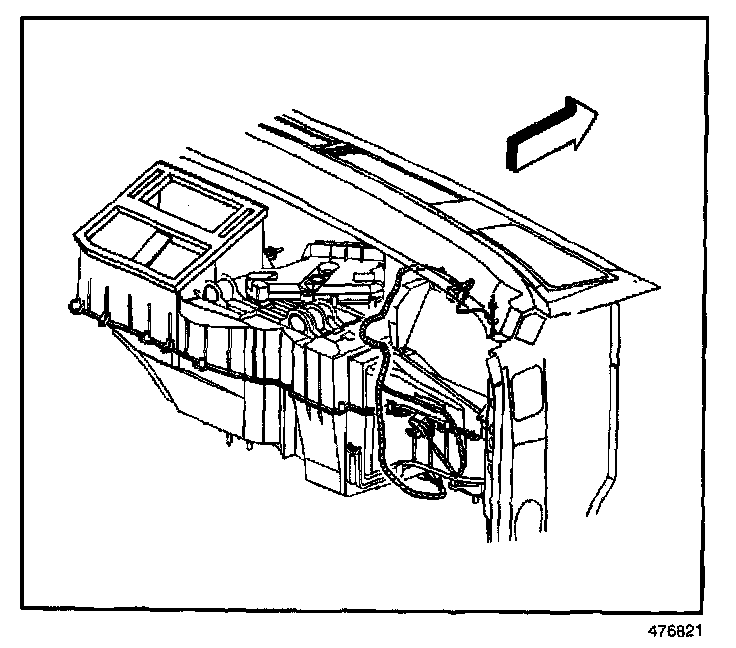 4. Pull the retaining tab down while turning the blower motor counter-clockwise in order to disengage the blower motor from the heater/ventilation module.
