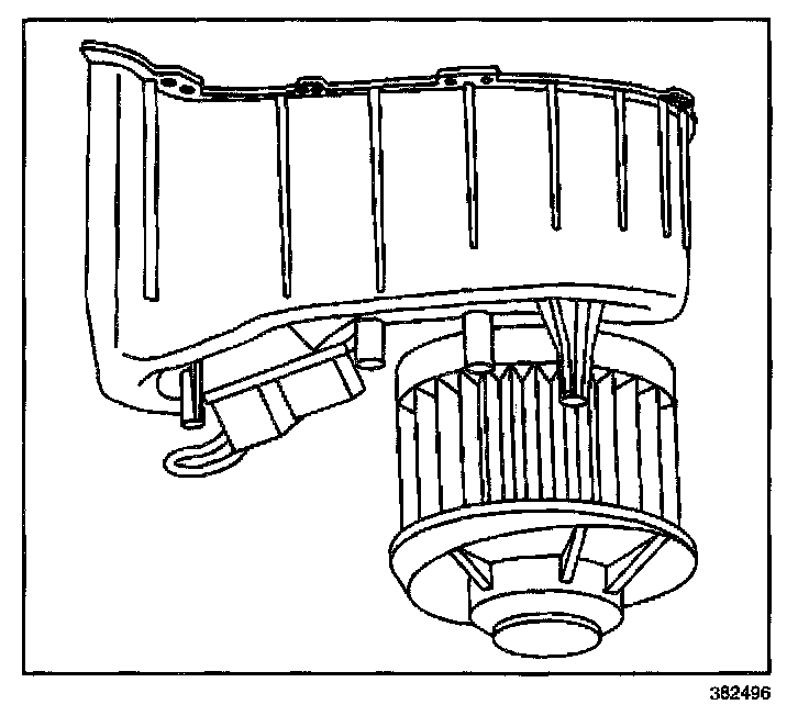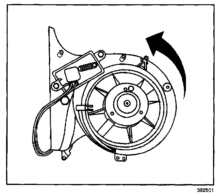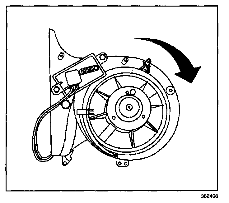 2. Install the blower motor to the heater/ventilation module. Turn the blower assembly clockwise until the retaining tab locks into place.
