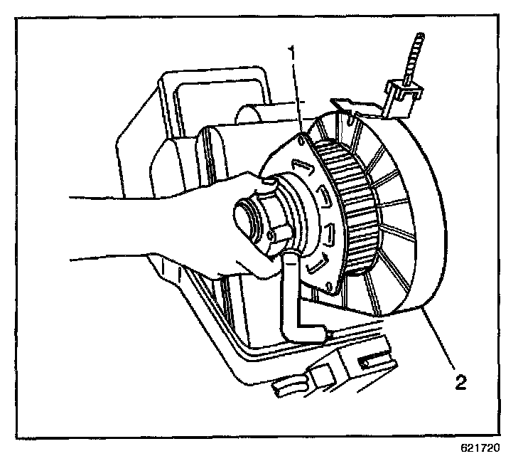 3. Install the blower motor (1) to the auxiliary HVAC module (2).