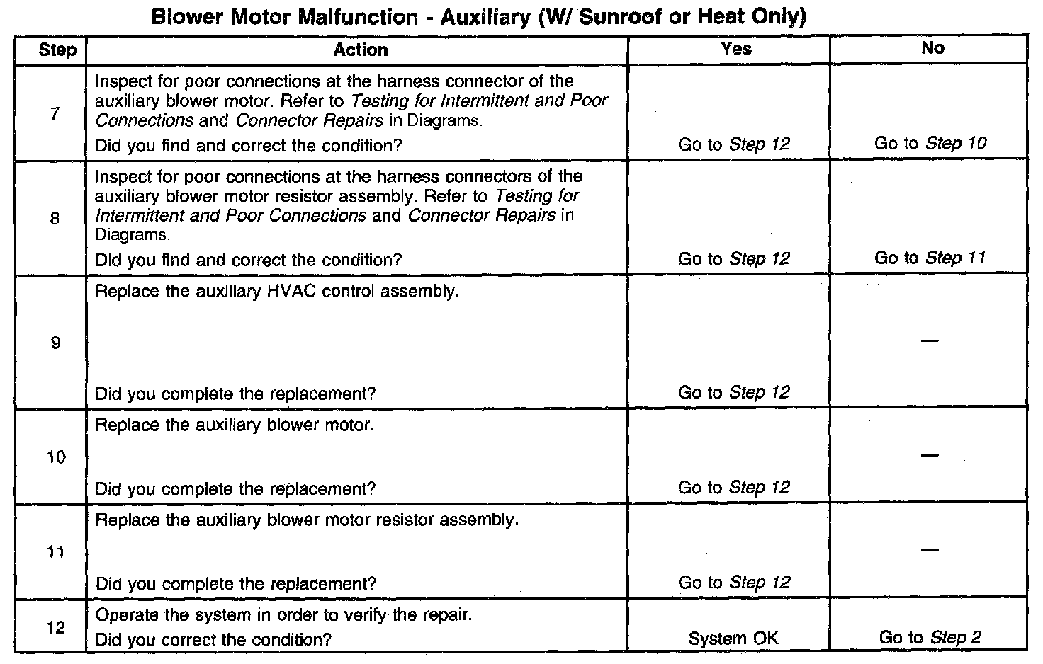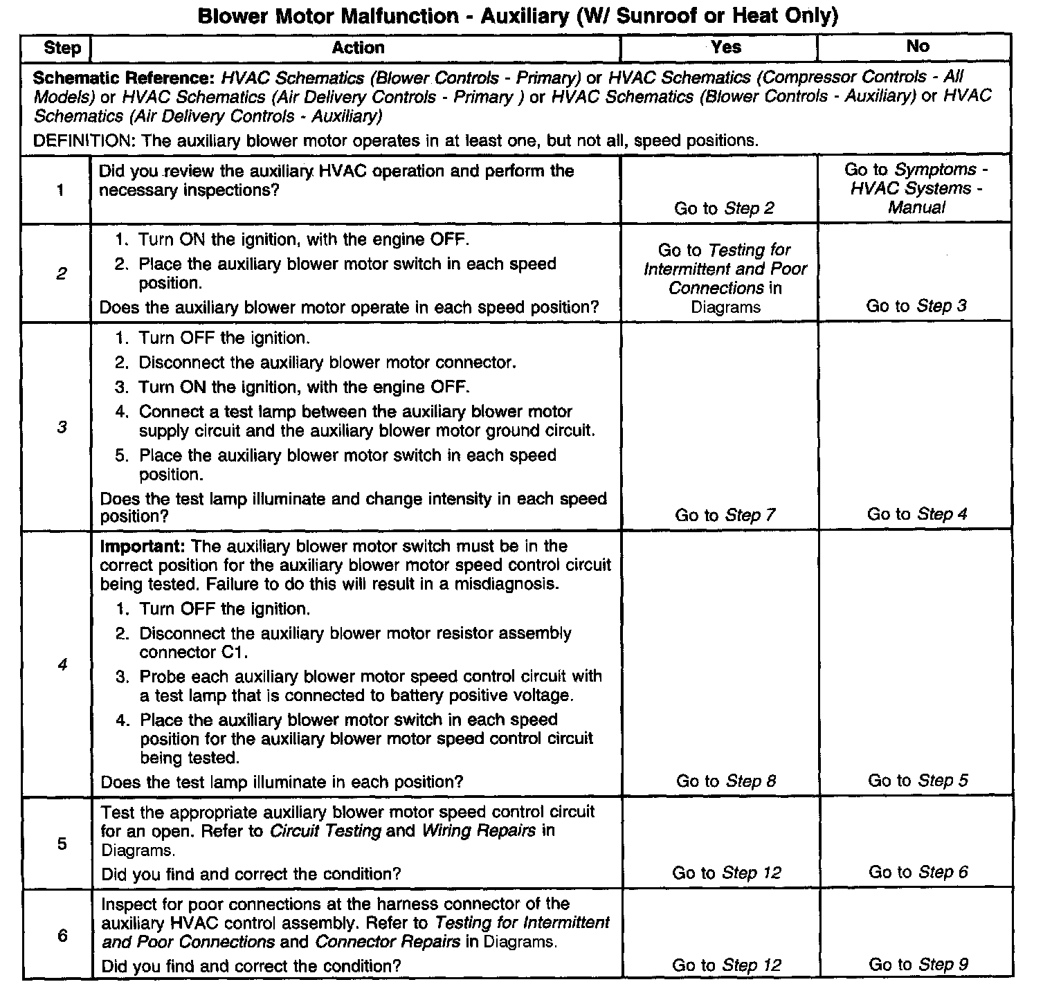 4. This step tests for an open in one of the blower motor speed control circuits and the auxiliary HVAC control switch ground circuits.