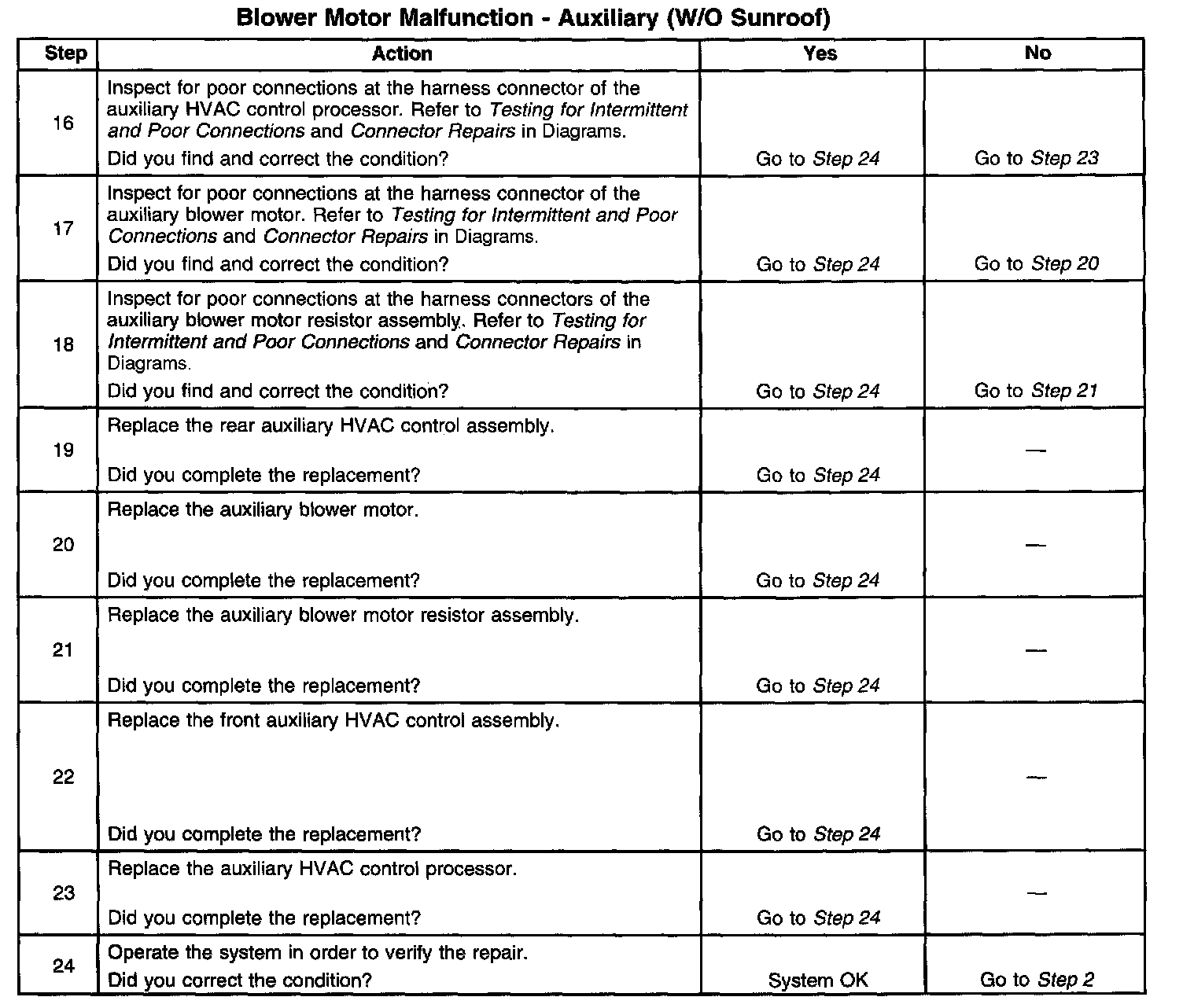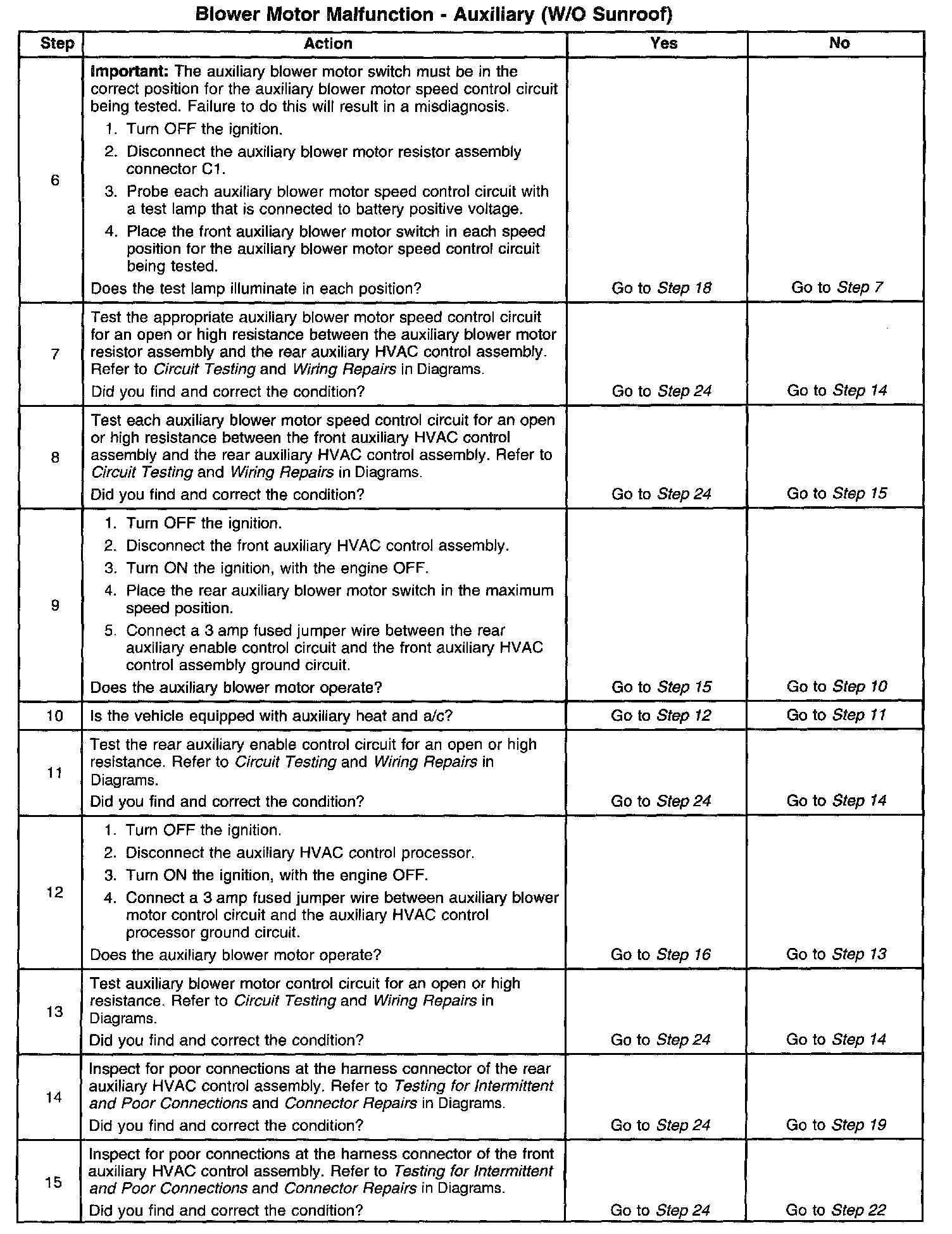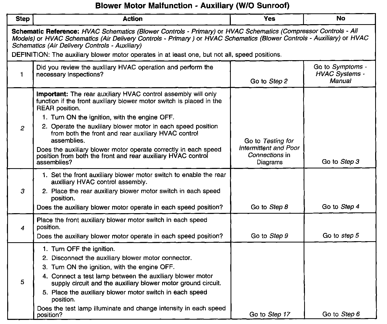 4. This step tests for an open in one of the blower motor speed control circuits and determines if the auxiliary blower motor and auxiliary blower motor resistor are functioning correctly.