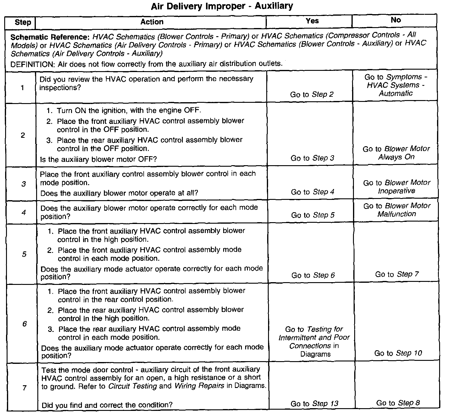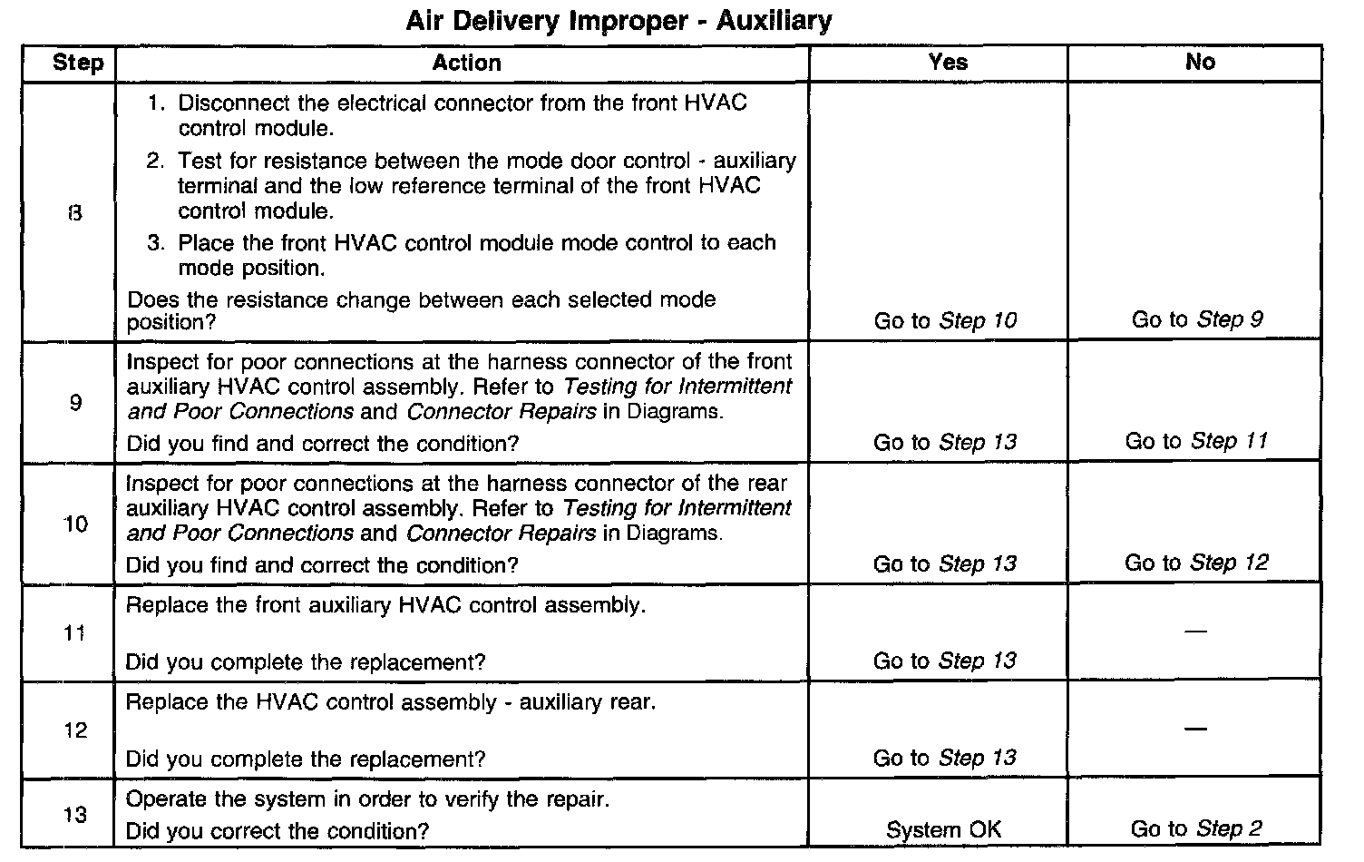 6. This step tests for an inoperative auxiliary mode actuator in one mode position(s) or in the wrong mode position(s) from the rear auxiliary HVAC control module.