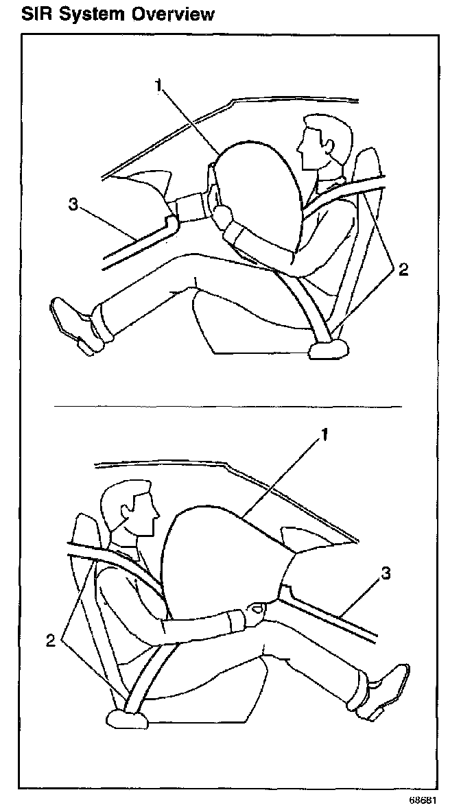 The Supplemental Inflatable Restraint (SIR) system supplements the protection offered by the occupant's seat belt system (2). The SIR system may contain several inflator modules located throughout the vehicle, i.e. steering wheel module (1), Instrument Panel (IP) module (1), and side impact modules. Each inflator module has a deployment loop that is controlled by the Sensing And Diagnostic Module (SDM) mounted inside the vehicle. The SDM determines the severity of a collision with the assistance of various sensor inputs. When the SDM detects a collision of sufficient force it will process the information provided by the sensors to further support air bag deployment. The SDM performs continuous diagnostic monitoring of the SIR system electrical components. Upon detection of a circuit malfunction, the SDM will set a DTC and inform the driver by turning the AIR BAG indicator ON. The steering column (1) and knee bolsters (3) are designed to absorb energy and compress during frontal collisions in order to limit leg movement and decrease the chance of injury to the driver and passenger.