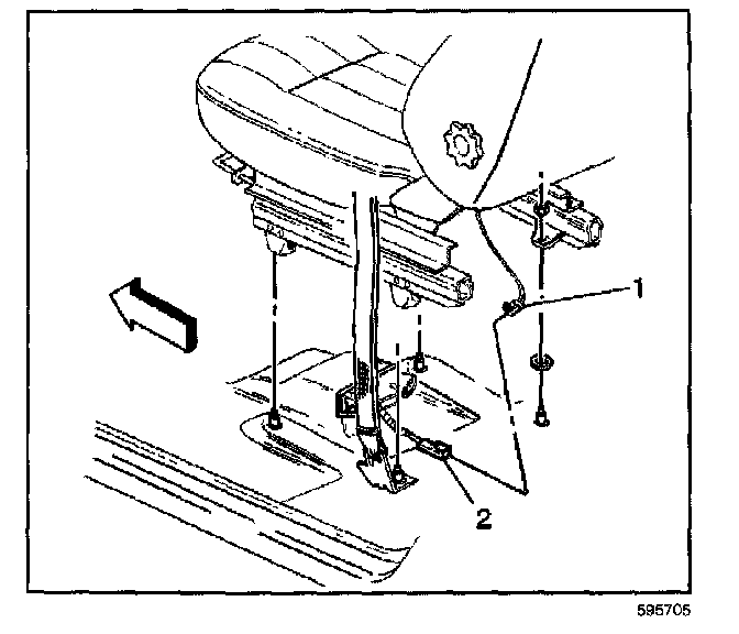 42. Disconnect the RF side impact module connector (1) from the vehicle wiring harness (2) located under the RF seat.