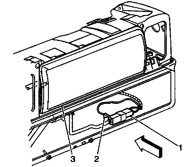 30. Disconnect the inflatable restraint IP module connector (1) located behind the glove box (3).
