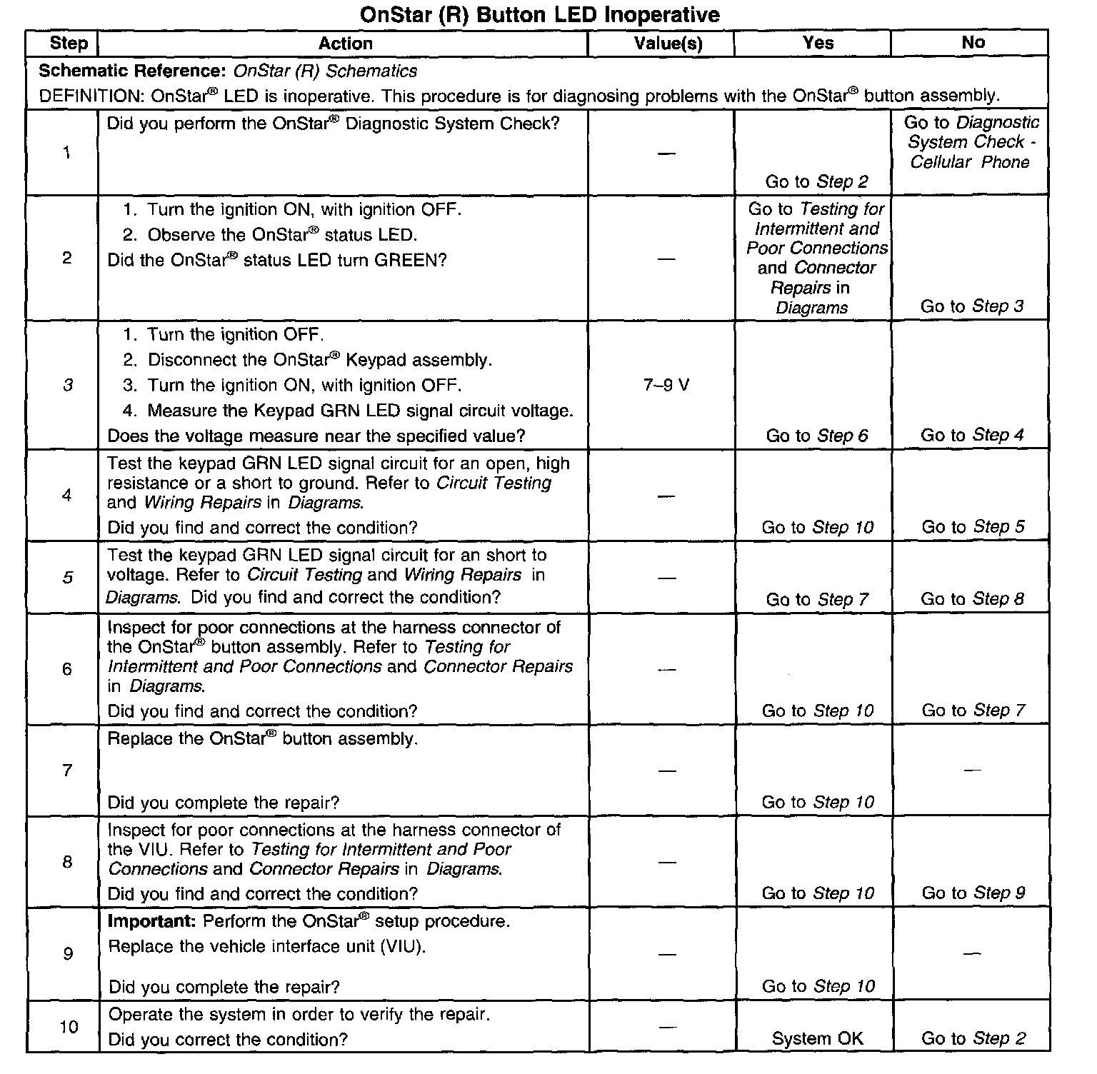 5. If the GRN LED signal is shorted to voltage then the OnStar(R) three button assembly has been damaged. The OnStar(R) three button assembly has to be replaced.