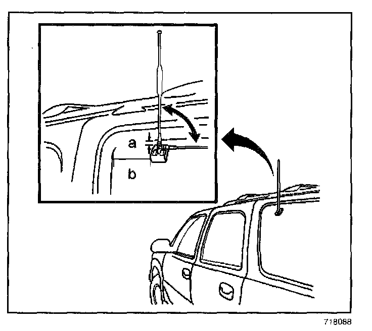 5. Install the cell antenna base to the inside of the glass so that measurement (a) is 12 mm (0.47 in) and measurement (b) is 215 mm (8.5 in) rearward of the third pillar.