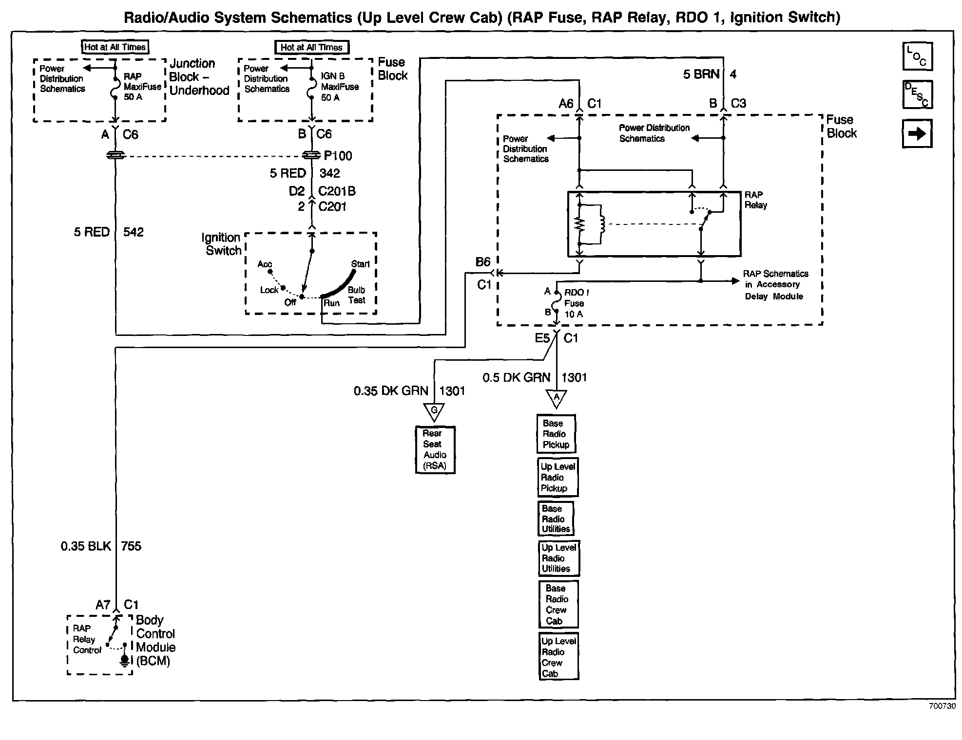 Radio/Audio System Schematics: Up Level Crew Cab (RAP Fuse, RAP Relay, RDO 1, Ignition Switch):